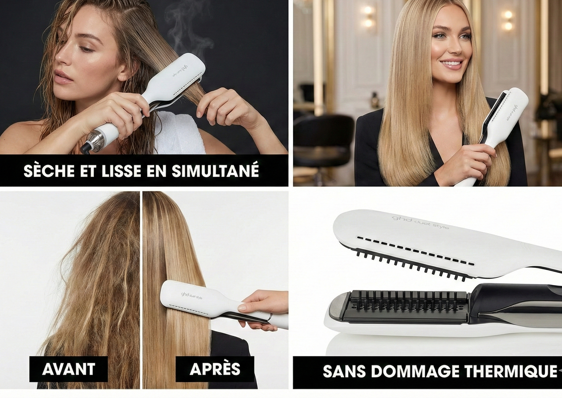 Découvrez le ghd Lisseur Séchant Duet Style 2-en-1, qui combine séchage et lissage en un seul geste, pour des cheveux lisses, brillants et sans frisottis en un rien de temps.